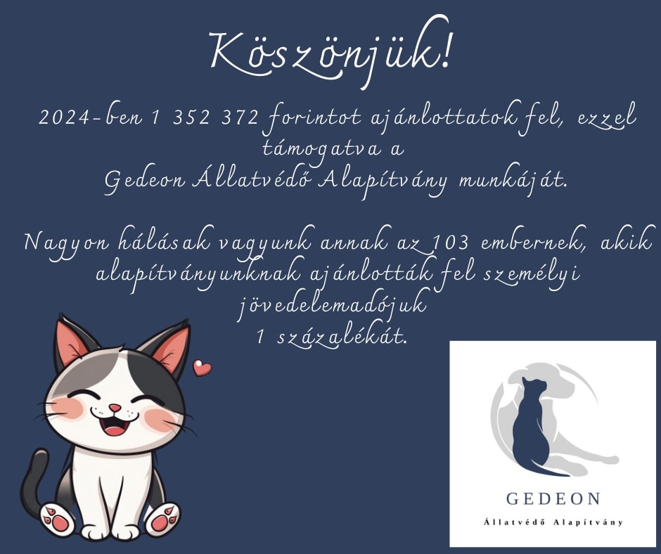 Minden egyes támogatás rendkívül fontos számunkra, és bár az összegek minden évben eltérőek, az a legfontosabb, hogy ezek segítségével folytathatjuk a munkát, amelynek célja, hogy a kóbor állatok számára jobb jövőt biztosítsunk. Munkánk nem valósulhatna meg a Ti segítségetek nélkül, és hálásak vagyunk, hogy számíthatunk rátok. Köszönjük, hogy együtt tehetjük lehetővé az állatok ivartalanítását, ezzel hozzájárulva a felelős állattartás és a kiszolgáltatott állatok védelme érdekében tett erőfeszítéseinkhez.