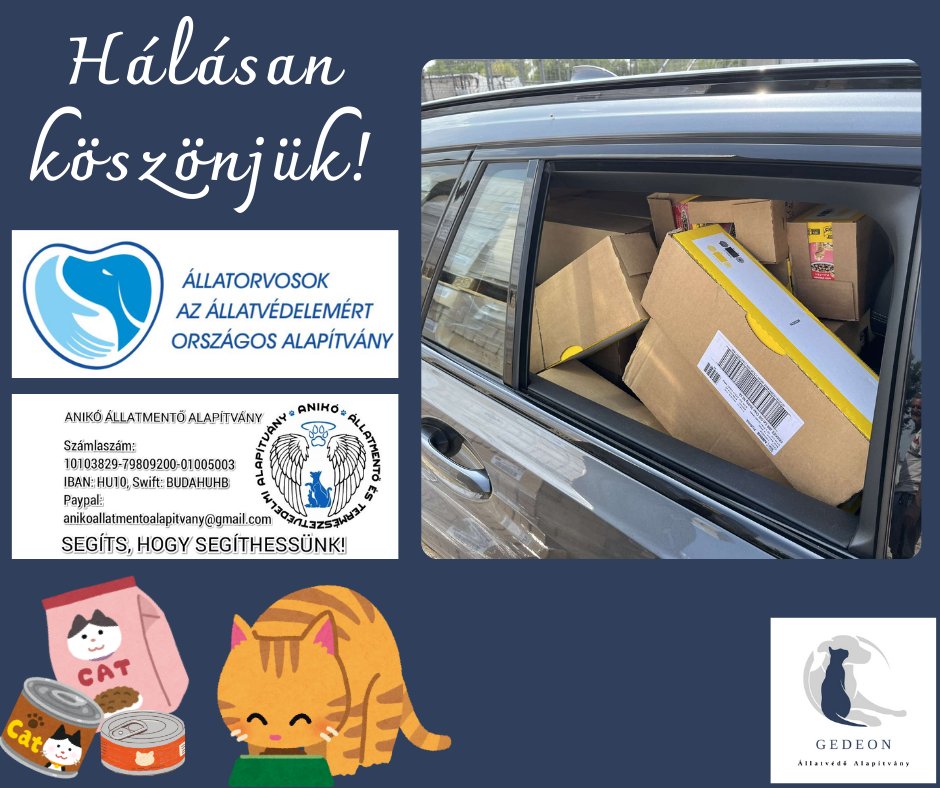 Hálásan köszönjük az eledel adományt, az Állatorvosok az Állatvédelemért Alapítványnak és adomány szétosztásának logisztikáját az Anikó Állatmentő Alapítványnak!