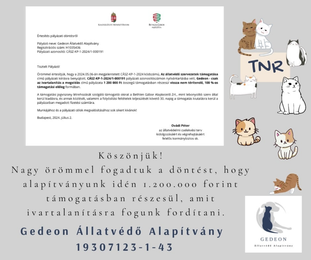 Szeretnénk szívből köszönetet mondani mindenkinek, aki támogatta munkánkat és hozzájárult ivartalanítási programjaink folytatásához! Külön hálásak vagyunk az 1%-os felajánlásoknak, melyeket szeptemberben kaptunk meg a NAV-tól, valamint a Bethlen Gábor Alapítvány, a Herman Ottó Nonprofit Intézet és a Hangya Közösség nagylelkű támogatásának.